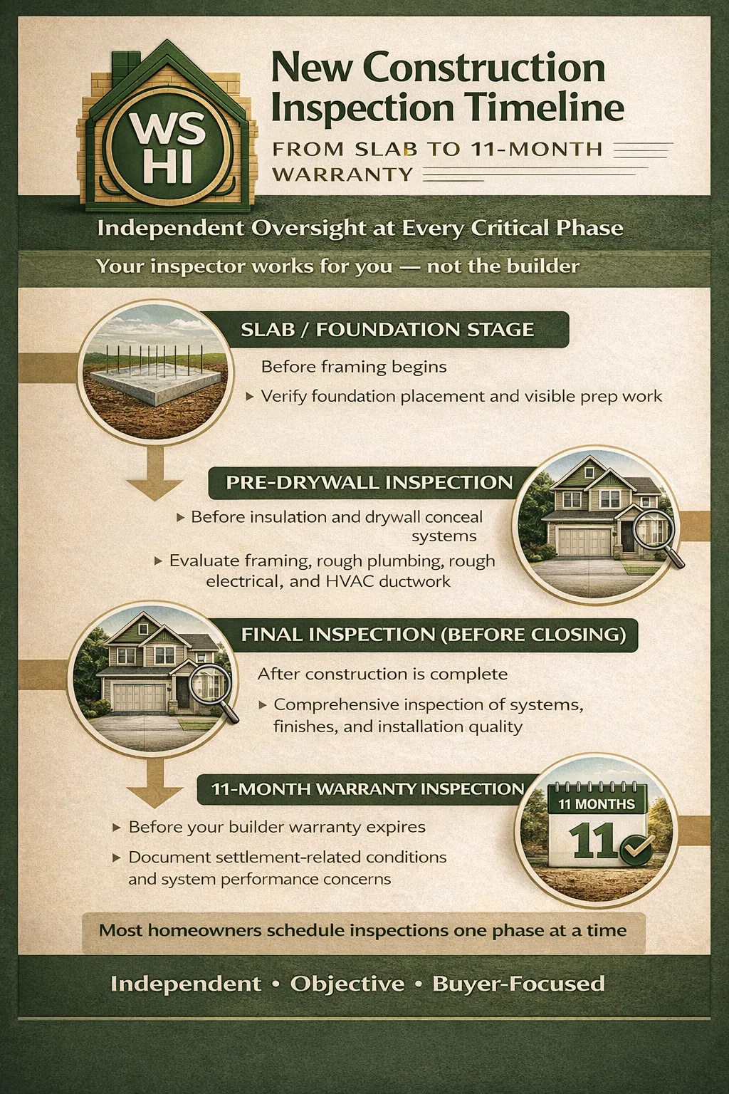 While not every buyer schedules every phase, independent inspections are recommended at each critical milestone of construction.