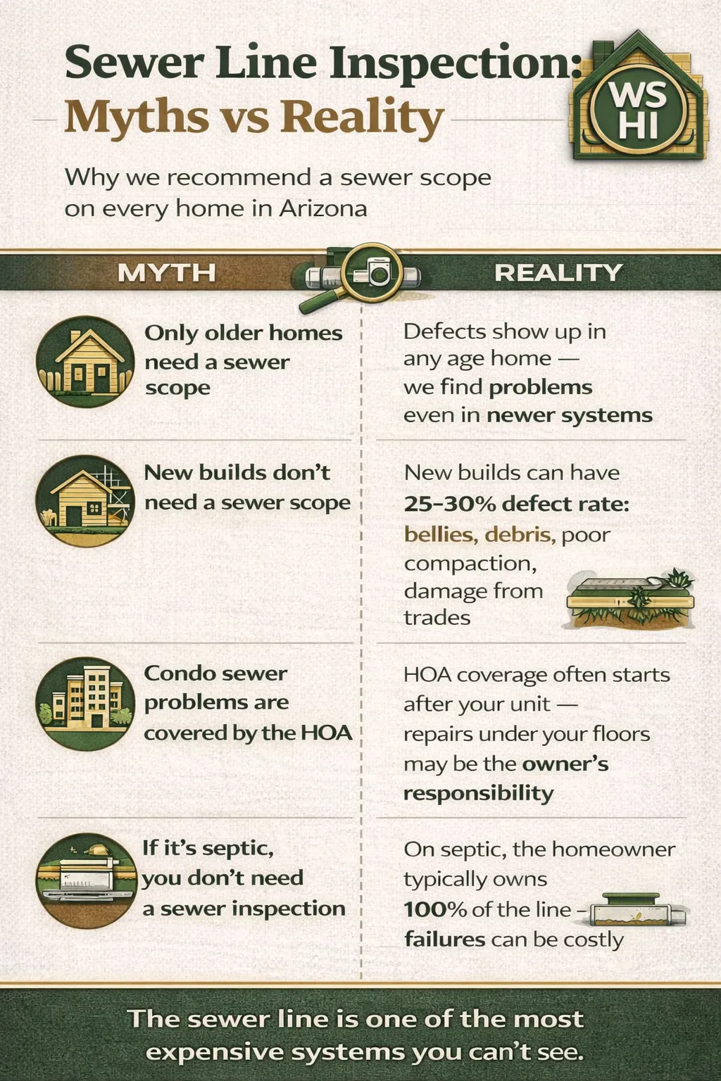 Most sewer problems are invisible during a standard home inspection. A sewer line inspection uses a specialized camera to evaluate the underground pipe from the home to the city connection or septic system. We recommend a sewer scope on every home - including new construction, condominiums, and properties on septic because defects are far more common than most buyers realize.